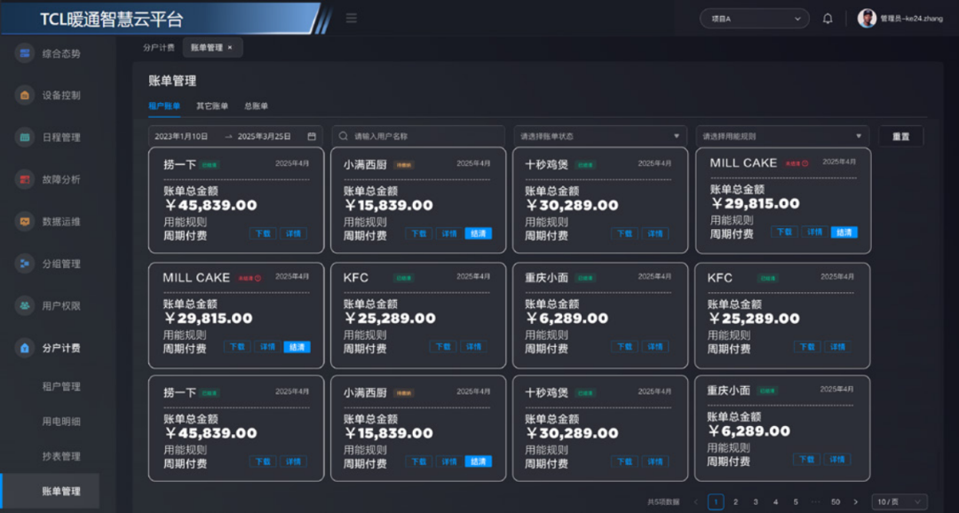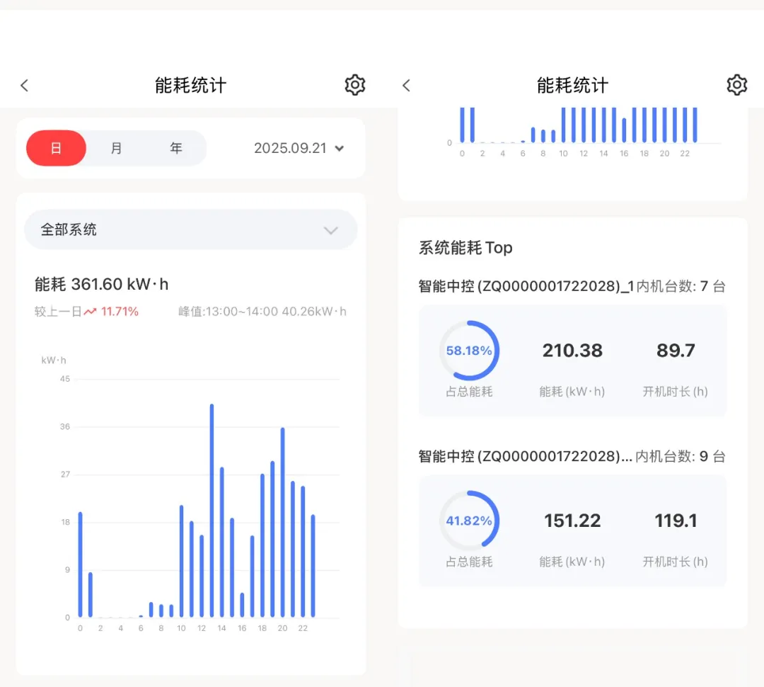 分户能耗精准计量系统能够动态分摊外机耗电量至各用户内机,通过智能算法确保在各种复杂场景下计费的准确性和公平性。无论是办公楼的不同租户,还是商业综合体的各个商铺,都能获得精确的能耗数据。对于连锁企业总部而言,系统支持实时查看各门店的空调用能情况,实现跨区域能耗对比与管理决策的数据支撑。对于门店现场管理人员,系统自动生成的清晰能耗报表,也极大简化了日常运维,推动节能行为落地。 由此,系统不仅在技术上实现精准计量,更在管理上为客户带来透明、高效、可追溯的用能体验,助力企业实现精细化能源管理。