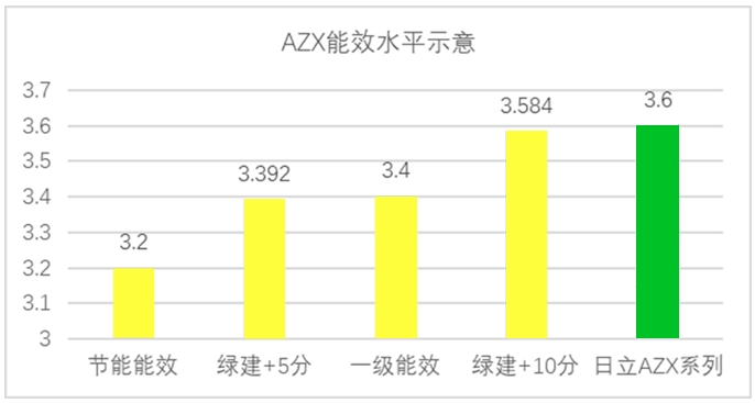 AZX系列风冷螺杆机组COP值平均达3.60以上,远超最新的能效国标一级能效等级要求。根据最新的《绿色建筑评价标准》,全系列机组可获10分满分评价。
