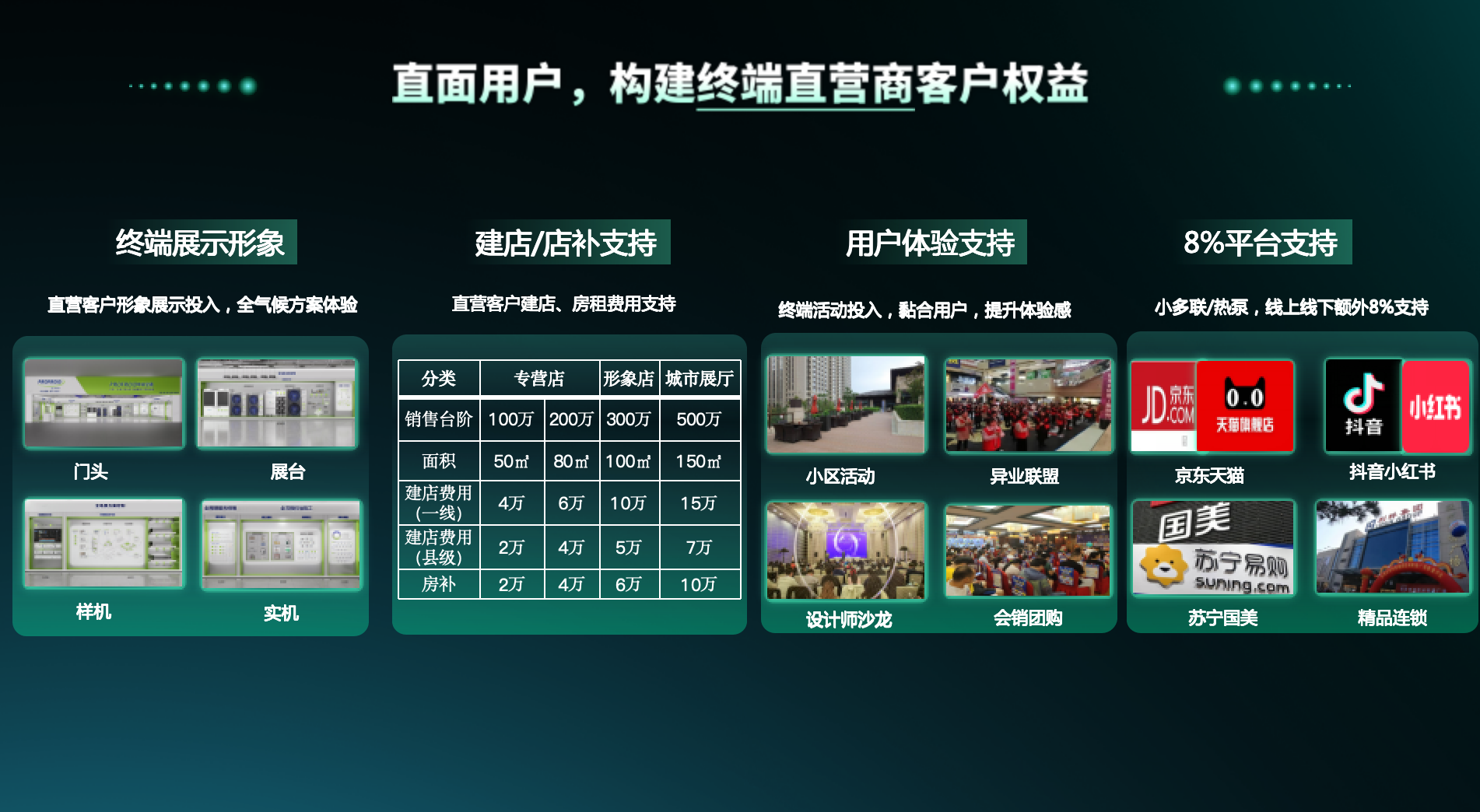 为助力合作伙伴开拓市场,我们推出系列市场支持举措:投入建店展示资源打造直营客户形象,提供全气候方案体验场景;给予直营客户建店房租费用支持;加大终端活动投入,增强用户互动与体验;针对小多联和热泵产品,线上线下额外给予 8%支持。