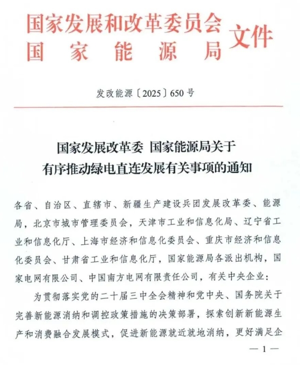 国家发改委、国家能源局联合发布的发改能源〔2025〕650号文件,明确提出绿电直连发展目标,强调以满足企业绿色用能需求、提升新能源就近就地消纳水平为核心,推动风电、太阳能发电等新能源通过直连线路向单一电力用户供给,实现电量清晰物理溯源。