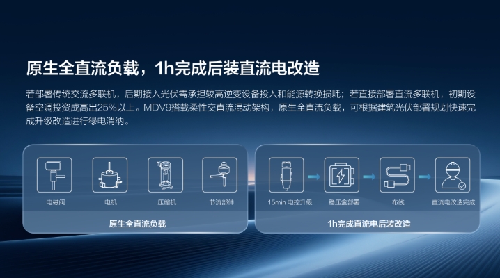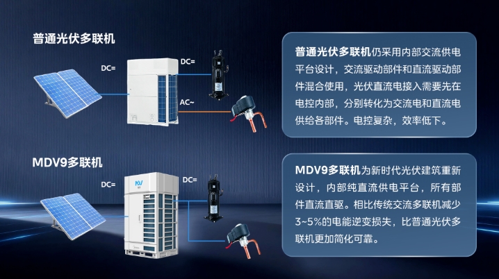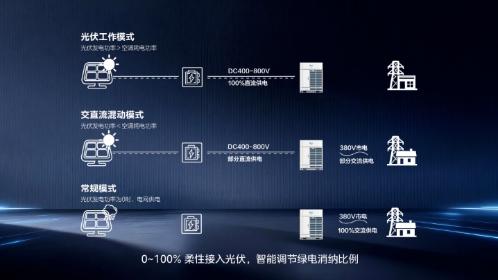 具体来看,其全系部件均采用直流直驱设计,不仅让MDV9架构较传统光伏多联机更简化、运行更可靠,还能减少3%-5%的电能逆变损耗;同时产品适配DC400V-800V宽电压区间,支持100%全直流供电,可实现光伏、交直流混动、常规供电三种模式灵活切换,既能0~100%柔性接入光伏电力,还能智能调节绿电消纳比例,最大化绿电利用效率。