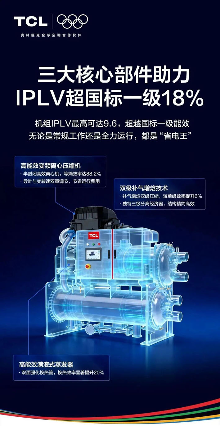 作为行业引领者,TCL智能暖通敏锐洞察这一趋势,将相关难题作为“切入点”,精准锚定用户需求,重磅推出TCL超高效AI变频磁悬浮离心机,该机组以TCL的硬核磁悬浮技术为核心,搭载高效核心部件,并融合AI智能算法,从能效、可靠、节能、运维四大维度实现新突破,为大型建筑提供了全新的高品质解决方案,也进一步推动了行业迈向“数字化、绿色化、高效化”的进程。